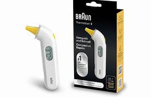 Fiable et facile à utiliser.Prise de mesure précise en 1 seconde. Indicateur de fièvre audio : 1 bip pour une température normale, 2 bips pour une température élevée et 4 bips pour une température forte. Design compact et ergonomique. Écran LCD sur le côté facile à lire. Embouts utilisables avec les nouveau-nés. Embouts jetables hygiéniques, sans BPA ni latex. Mise en mémoire de la dernière mesure pour comparer. Arrêt automatique après 60 s. Lecture en °C ou °F. Couvercle du compartiment à piles conçu avec un verrouillage de sécurité pour empêcher tout risque d’étranglement. Fourni avec : Un capuchon pour protéger le capteur. 21 embouts jetables.